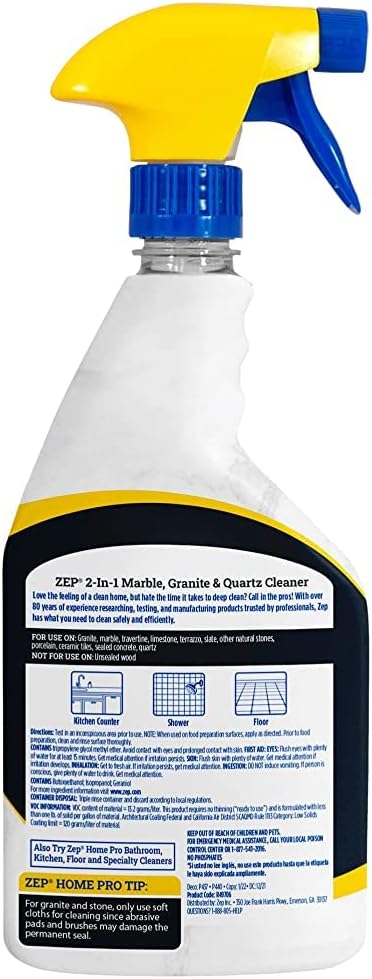 Discover the best way to clean marble, granite, and quartz countertops. The Zep 2-in-1 Marble, Granite & Stone Cleaner features unmatched technology to clean and protect delicate stone surfaces while filling your kitchen with the essence of sun-soaked Eucalyptus and citrus undertones. This stone cleaning solution creates an innovative invisible barrier to protect and prevent stains on your natural stone surfaces. Featuring long-lasting stain protection, the 2-in-1 countertop cleaner cleans and protects stone in one easy step. Simply spray the intended area and wipe clean with a gentle cloth. For best results, only use a soft cloth when cleaning granite and stone surfaces. Abrasive pads and brushes may damage the surface’s permanent sealant. Not only does the 2-in-1 cleaning technology leave your stone countertops protected, but it also leaves your kitchen refreshed with the premium fragrance of eucalyptus lemon. But don’t just stop in the kitchen! In addition to countertops and stone cooking surfaces, the 2-in-1 Marble, Granite & Stone Cleaner is the perfect solution for your showers and floors, as it works to clean and protect porcelain, ceramic tiles, & sealed concrete.
