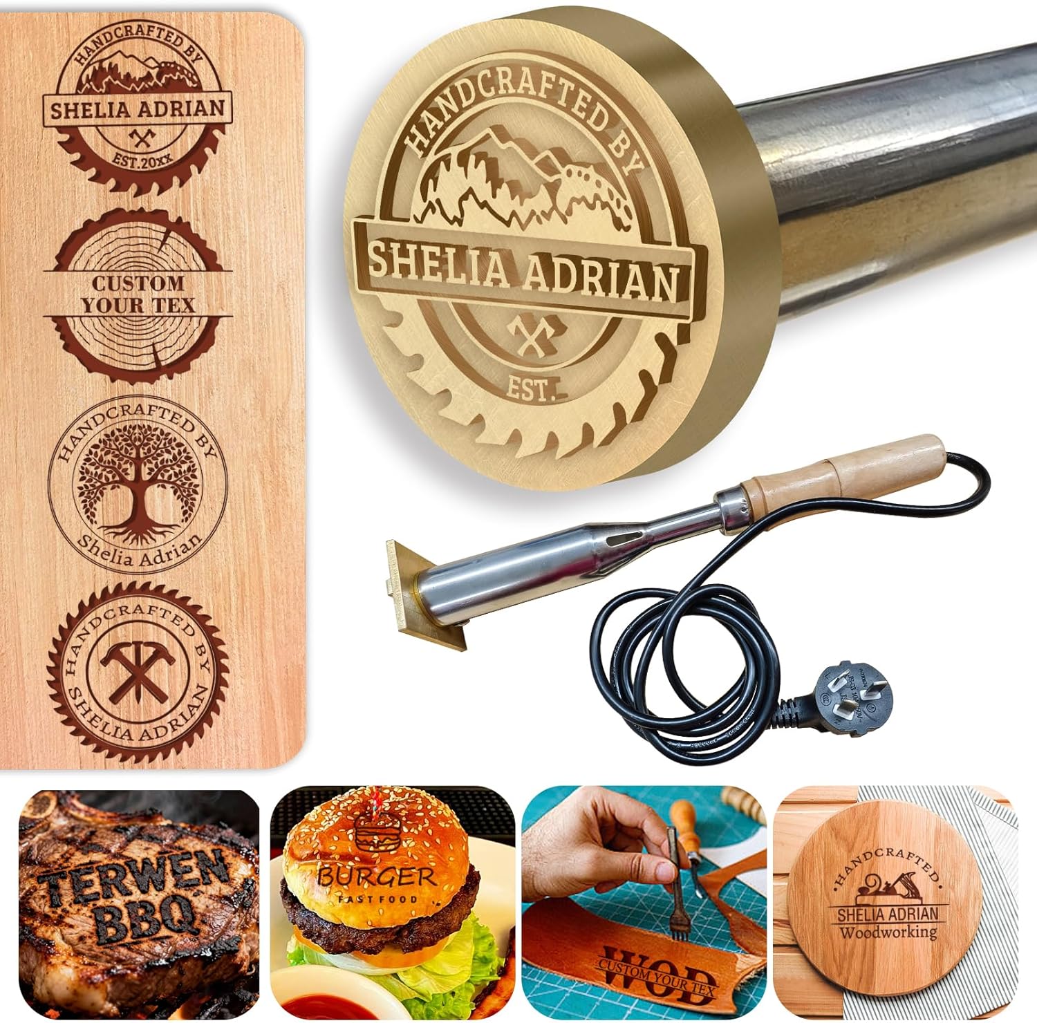 Brass stamp: 1 inch, 1.5 Inches, 2 Inches, 2.5 Inches, 3 Inches, 3.5 Inches, 4 Inches Custom Branding Iron (Fire-Heated) Best for: traditional makers, outdoor use, rustic appeal Features1.Heated with gas stove, torch, or open flame 2.No electricity required 3.Classic, traditional branding experience 4.Lightweight and portable Advantages:Works anywhere, Lower cost option, deal for occasional use, Authentic handmade feel Curved handle:11.2 inches Straight handle:11.2 inches Custom Electric Branding Iron (Plug-In) Best for: frequent use, beginners, workshops, and businesses Features: 1.Built-in electric heating element 2.Consistent, stable temperature 3.No open flame required 4.Easy on/off operation 5.Ideal for repeat branding and production work Advantages:Faster workflow,Safer indoor use,Uniform burn depth,Minimal learning curve Personalized Gift—Custom Logo Wood Branding Iron: Permanently brand names, logos, or designs onto wood. Thoughtful, practical, and uniquely crafted, it's the perfect gift for creative individuals who appreciate quality and craftsmanship. How to Use: Electric Version: Plug in → heat 5–8 min → test → press 2–5 sec → unplug & cool Fire-Heated Version: Heat over flame → test → press firmly → allow to cool