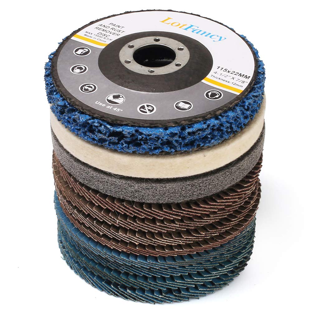 Stripping, Finishing and Polishing in One Pack LotFancy Flap Discs & Grinding Polishing Discs kit provides you with stripping, finishing and polishing wheels in one pack, satisfying your requirements from removal to fine polishing. Each disc is bonded with fiberglass backing to absorb tool vibration and offer additional durability and reinforcement. Grinding & polishing discs set is specifically used for cleaning, finishing & polishing on metal, stainless steel, copper, iron, aluminum, glass, jewelry, medical instruments, plastic, ceramics, marble, wood crafts, etc. Widely used in aerospace, plant maintenance, foundry, automotive, metal fabrication and shipyards. 4-1/2" Diameter with 7/8" Arbor discs set fits most 4.5 Inch Angle Grinder, such as DEWALT DCG414B, DWE402, Makita 9557PBX1, Bosch 1375A, GWS8-45, PORTER-CABLE PC60TAG, PCE810, Black & Decker BDEG400, G950 and more.