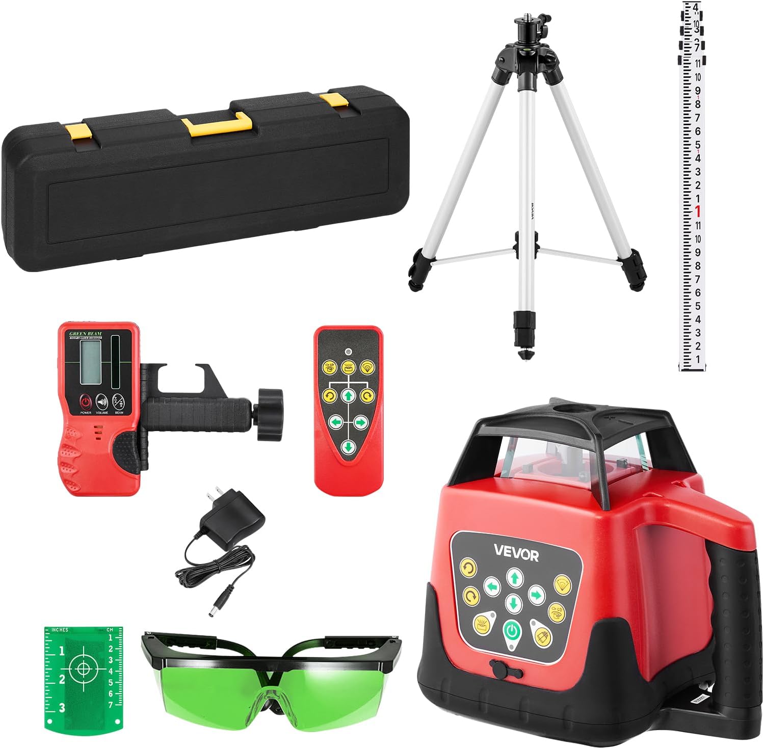 | Included Components | 1 x Adapter (US Standard), 1 x Laser Glasses, 1 x Laser Receiver, 1 x Laser Reflector, 1 x Lightweight Tripod, 1 x Plastic Toolbox, 1 x Remote Control, 1 x Rotary Laser Level, 1 x Scale, 1 x User Manual |